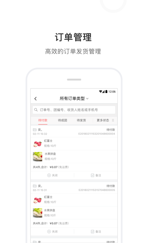 手机随时随地添加商品、查看订单,并可一键转发到微信、微博、QQ空间等多个平台。