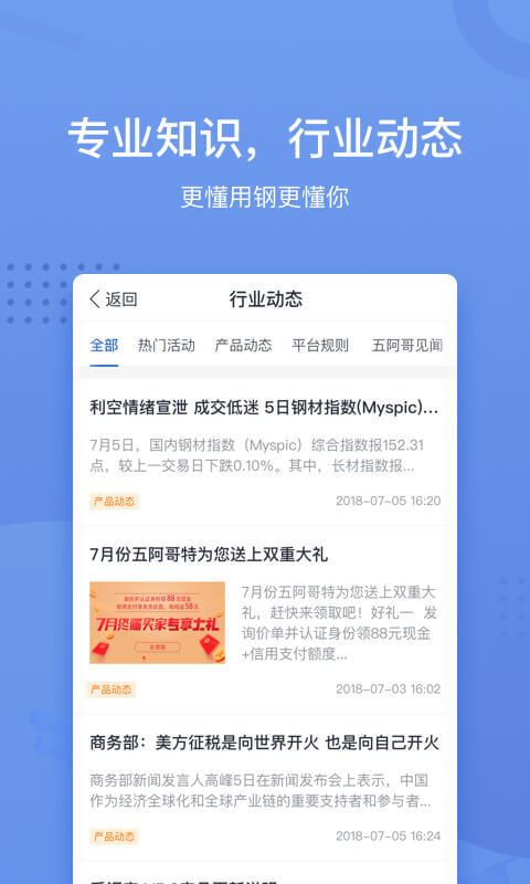 “采钢宝”提供PC端、App端、微信小程序、WAP站等多端服务,实现了买卖家线上、线下询价沟通的全场景覆盖,是终端买钢和供应商卖钢的贴心助手。结合五阿哥提供的市场营销、供应链服务等,为用户提供买钢、卖钢的无忧体验。