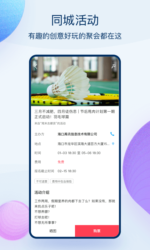 范团App,是一个面向海南用户的兴趣社群圈子平台。您可以在这里看到海南本地接地气又新鲜的街头巷尾大小事儿,也可以参与和创办丰富多彩的海口生活社交圈子,玩转美食、运动、文艺、旅游、摄影、亲子等等丰富多彩的话题与活动,如果你是有想法的行动派,快来范团找组织,释放有趣的灵魂,秀出有范的青春!来范团,我们一起开启有范又有趣的海南生活圈。