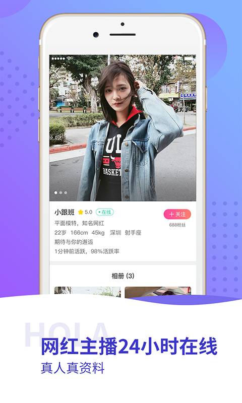 hola 红辣椒是一款一对一视频聊天交友软件。采用目前直接高效的视频社交模式,汇集大量热门主播,模特,演员,明星,还有微博百万粉丝的网红博主。在hola 红辣椒,您可以随时和她们一对一视频互动,私密聊天。帮你开启零距离的一对一视频交友体验,让您迅速的认识心怡的博主。如果您是网红博主,在hola 红辣椒能让你的时间产生价值。