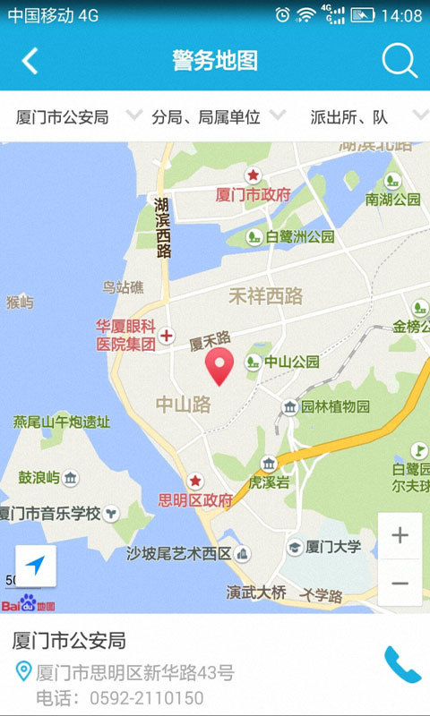 “警务地图”全面收纳了全市公安机关、社区警务室及流动人口服务站等机构信息,并将这些信息在地图上直观的进行展现。市民可以利用“警务地图”功能,查询到各级公安机关的地址、联系电话、外观照片等信息,了解到各社区警务室地址、社区民警的姓名及联系方式等情况。提供一键拨打分局电话功能,提供快速定位用户当前位置,且手机有安装百度地图,点击公安分局信息模块可快速进入百度地图使用更多功能。