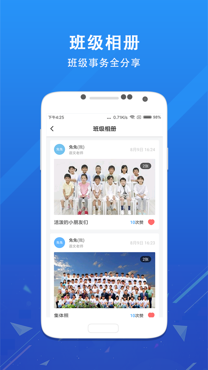 - 班级相册:查看老师发布的班级相册,点赞互动;