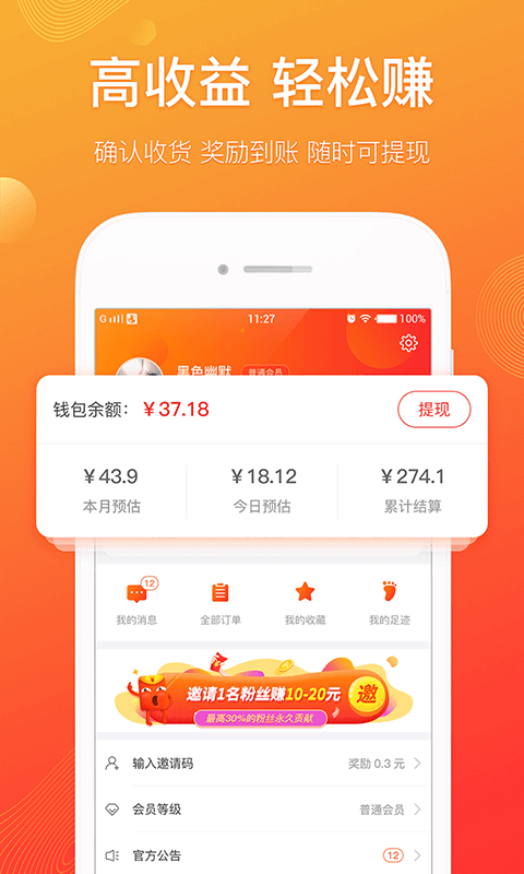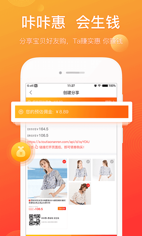 手机必备省钱购物App,海量高额优惠券让你领到手软,买之前就来咔咔惠搜索优惠券,先领券再下单!节省可达80%!更有各种促销活动。价格低到你尖叫!您还可以通过分享商品,随时随地赚钱,产生成交,获得高额佣金。多劳多得!让您购物的同时也能创造价值