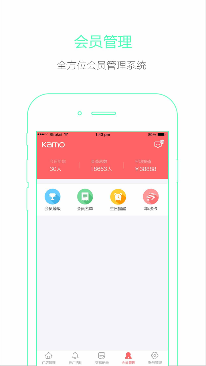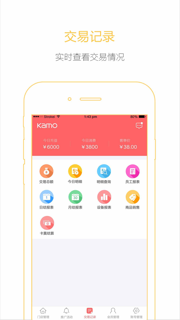 卡莫商户端是卡莫系统中的一部分,供商家使用。商家可通过该应用创建店铺,并且将店铺与卡莫POS关联,加入卡莫预付系统。进行店铺信息管理,店员管理,优惠活动添加等功能。