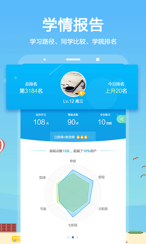 1、 丰富全面的学习练习内容,包含了音符、音阶、键盘、音程、和弦、节奏、旋律、调式等多种内容。