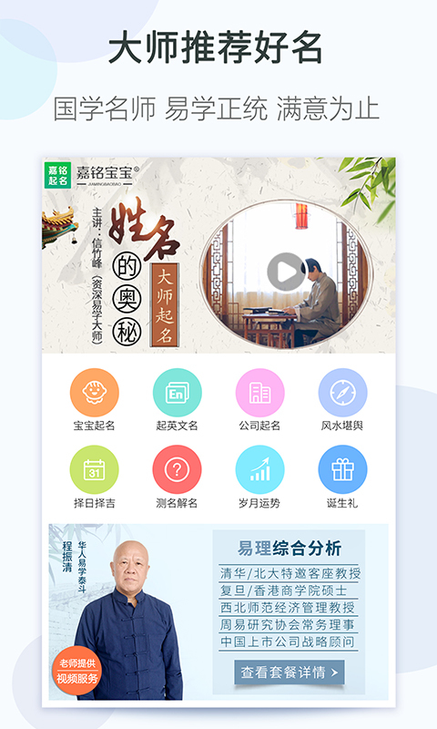 4. 嘉铭取名软件专业易学大师团队 – 程振清(前西北师范大学教授)、姜汇峰(青岛国学会会长)、信竹峰、侯禹封等老师在线为您取名字,答疑解惑。