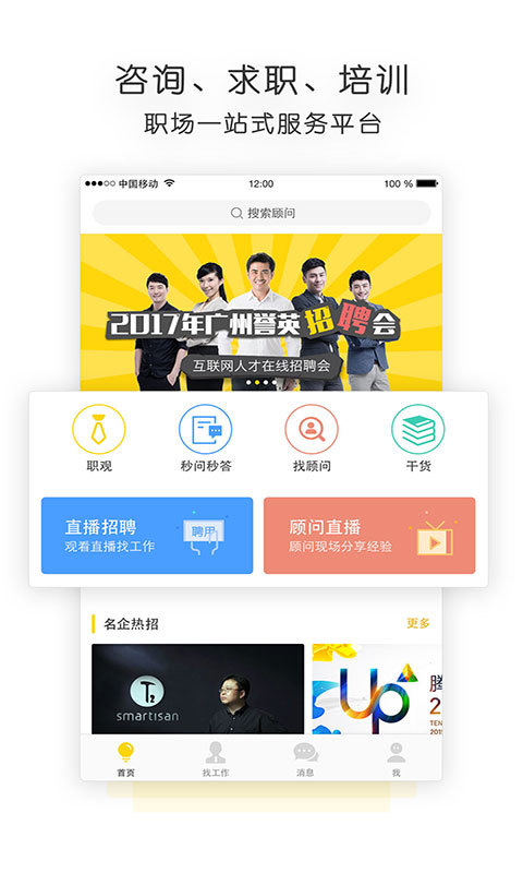 顾问直播:邀请各个行业领域中的大咖直播讲课,为你传授求职就业、职场成长、技能进阶的知识经验。