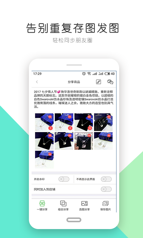 【终身免费,千万卖家的选择】一键抓取网站。支持分享至各大社交平台。 【一秒开店】注册登陆后就拥有了一个移动店铺,操作简洁,极易上手。 【店铺数据管理】4年的运营经验总结,解决用户刚需。除了提供一般商品发布,编辑,删除,上下架之外,所有的操作支持批量,还有一套进销存系统。 【一键转发】是目前一键分享强大的平台。支持分享到微信朋友圈,微博,QQ,支付宝,微博等。 【安全保障,高清无损】所有分享方式都属于官方合作或官方接口分享,不存在有封号风险,分享多次都是高清原图 【好友无上限,消息推送,客户备份】好友数量无限制,轻松应对数万上十万的好友管理 【让所有代理免费拥有批量转发】你只需要让你的代理通过你的二维码下载微销通即可互相关注,除了批量分享你的所有商品之外,还拥有以上所有功能。 【微商城,在线支付】可以H5微商城的方式整店分享至朋友圈,让客户在朋友圈自助下单购买。 官网:www.4swd.cn 服务热线:400 – 1659909 企业合作邮箱:fengnanwlkj@163.com