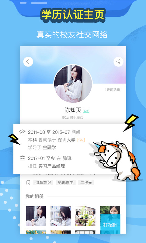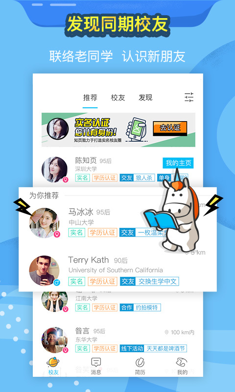认证学历,发现同期校友。完善个人主页,查看附近的人,认识新朋友。