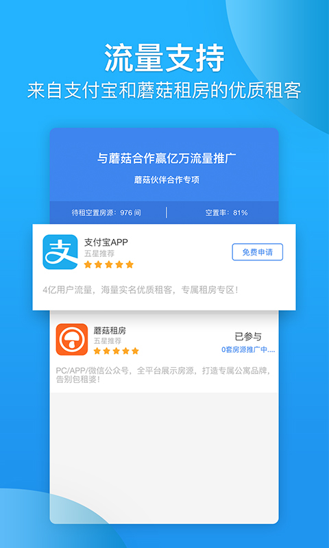 蘑菇伙伴APP是蘑菇租房专为房东打造的专业房源管理软件,帮助提升出租效率,简单实用易上手,一个人一部手机管理一栋楼,快来下载吧!
