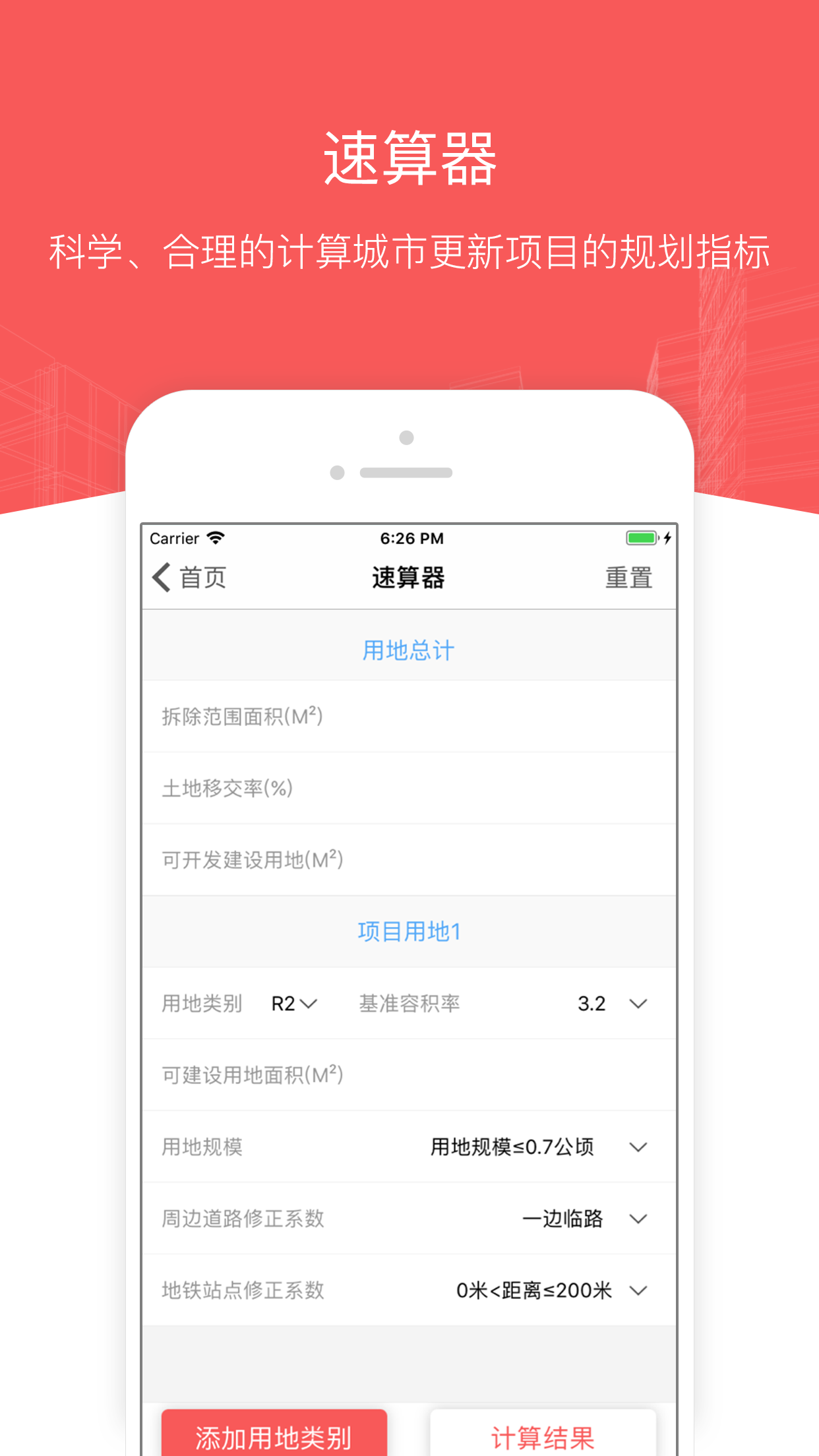 一款包含城市更新资讯工具类app,包含 速算器:快速计算,政策通:新资料一首掌握,号外:新闻资讯,研判,报建,专家资讯、投融资与不良资产等功能