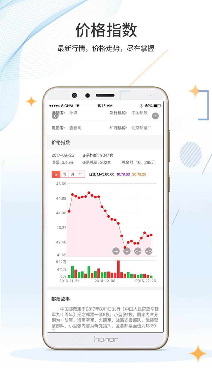 同时,用户可通过价格指数版块,随时查询邮票市场各地成交量、成交价格、涨幅比,价格指数一目了然。
