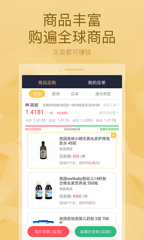 百元易购是新一代的跨境电商消费新模式APP,商城除了零售跨境商品外还可通过批量定购跨境商品,从货币价格波动中赚取丰厚利润。定购、退定批量商品还能赚钱哦~