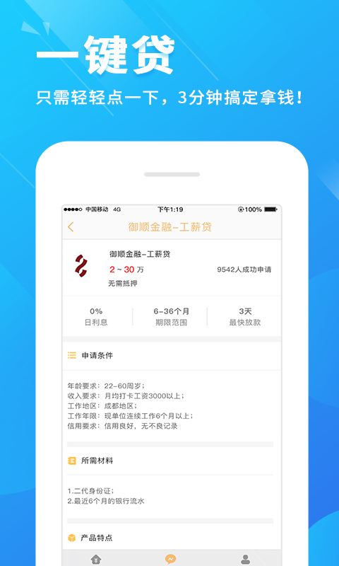 需要钱,惠融易! 【无付出】没车没房没关系,一部手机即可贷! 【一键贷】只需轻轻点一下,3分钟搞定拿钱! 【产品多】上万产品任你选,取钱如同逛超市! 【利息低】多方合作,集中放款,利息超低惠融易! 【小额贷】500起借,随借随还,想借多少借多少!