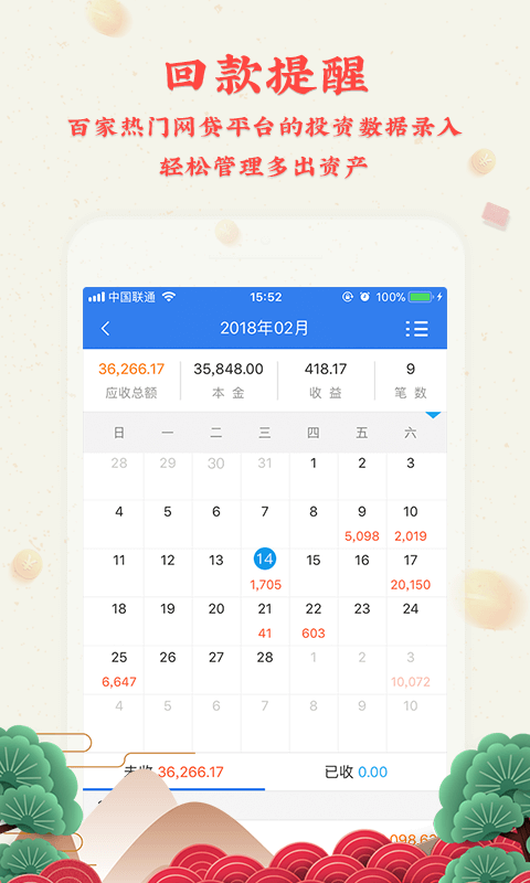-自动跟踪多种资产明细账单、资产走势、回款到期等。
