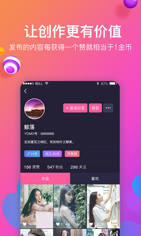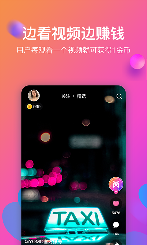 YOMO——让内容创造更有价值 应用介绍: YOMO是一款创新的视频社交软件,精选千万精彩视频,观看大神戏精们的搞笑日常。关注喜欢的视频上传者,时时围观TA的精彩生活。同时观看视频可以获得更多收益,让你的内容创造更加有价值。?简洁的界面切换,和你的朋友随时互动聊天,创新AR红包,独特投放方式,满城待领红包!