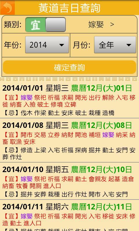 开运农民历参考古书,并擷取各大择日馆的红皮通书,提供*準确的黄历内容。开运农民历提供四大功能1. 农历:包含每日的节气、节日、提醒、宜忌、冲煞、吉神、凶神、五行、彭祖百忌、胎神占位、时辰吉凶。 使用方式:左右滑动更改月份;上下滑动更改年份;点击上方日期,可选择查询日期。2. 黄道吉日查询:可以选择类别与查询的日期范围。3. 教你看懂农民历:以*快的方式,解释黄历常用的名词术语。4.未来一週气象预测,必须连上网路。本程式包含中文繁体与简体版,适用於手机与平板电脑,提供完整的农民历(黄历),採用简洁介面,供使用者方便查询黄道吉日。