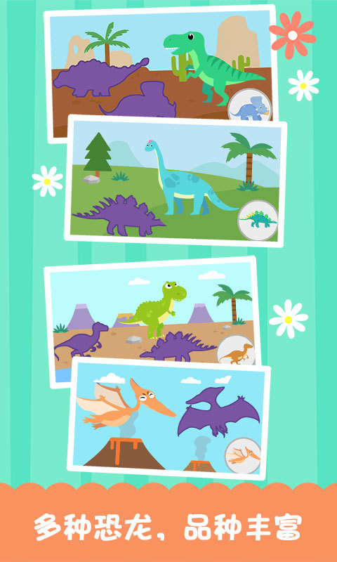 恐龙拼图:游戏图片经过精心设计、色彩斑斓、动画符合儿童玩家的喜好,可以调节难度。