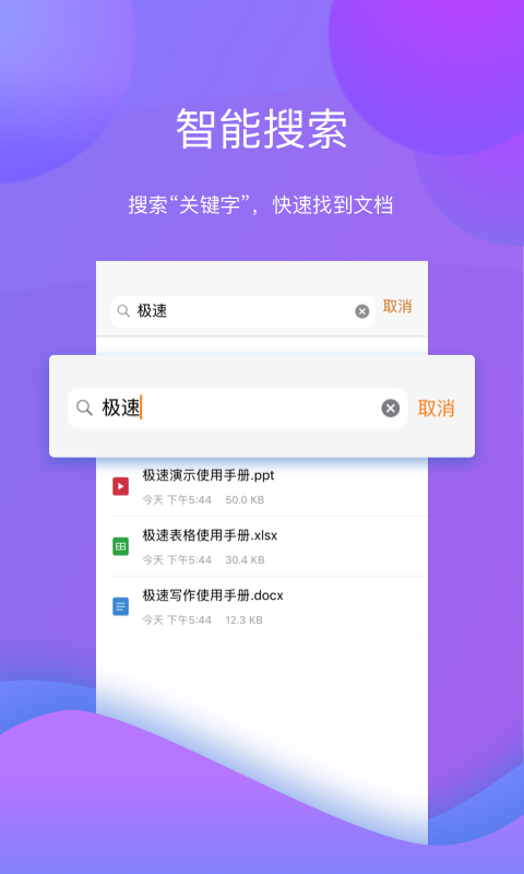 极速Office是一个方便、快速、无广告的Office办公软件,支持极速写作、极速表格、极速演示的创建、编辑、阅读;全面兼容微软office97-2016格式(word:docx、doc;excel:xlxs、xls;ppt:pptx、ppt等);支持一键另存为pdf、txt、图片等常用格式阅读;内置PDF渲染引擎,支持PDF文档直接阅读;界面简洁、操作简单的极简办公office;且重新定义下一代办公,为用户提供真正省心、有价值的高效的办公。