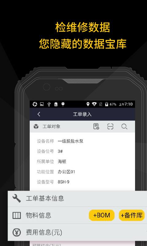 【主要功能】 1、设备资产管理:记录并管理设备相关数据,包括设备属性(设备的原始凭证、数据管理、检修记录等)。 2、检维修管理:记录故障与计划项目检维修处理过程及结果,轻松创建工单,并对工单进行管理以及跟进,直至归档。 3、维护移动管理:从现场清晰反馈问题(拍照,录音,故障记录、保修及故障消除),按照规程保质保量完成工作。 4、维护保养计划:为企业的任何一组设备建立计划,定义好所需的资源、备件、注意措施以及相关文档。 5、费用管理:采用科学有效的绩效指标体系对检维修历史费用分析,为预算制定提供支持 6、统计分析:统计分析全寿命过程中的各种数据及发生的费用,通过图表报告对故障进行合理分析,做出决策。