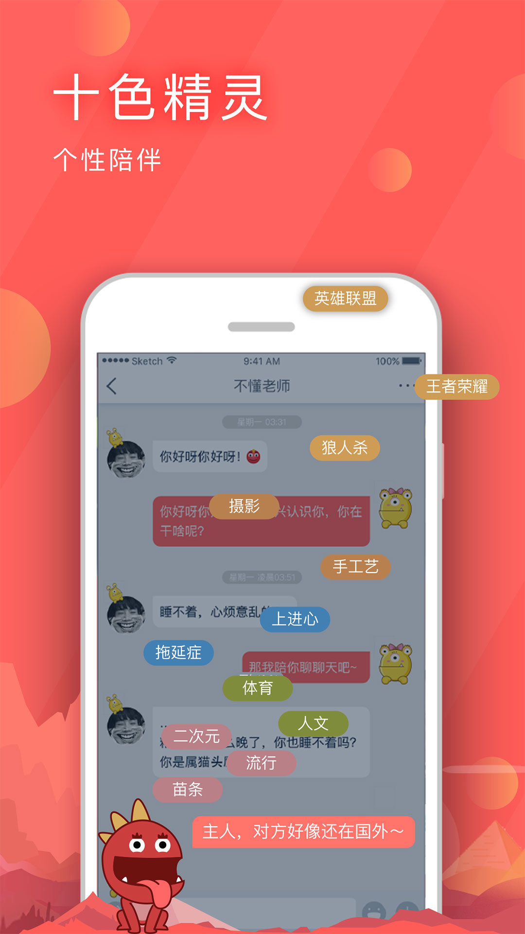 「十色谷」里住着十只可爱善良的小精灵,只要点击“精灵陪伴”,你所有的喜怒哀乐都可以找它们一吐为快,它们会不离不弃的陪伴着你,当然小精灵的更多玩法还等待你开发,but需要注意的一点:对它好一点,别把它玩坏咯!