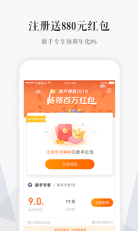 【新手福利】三分钟轻松开户,注册即享880元红包,新手专享1月标、年均出借回报率约9%。推荐邀友坐享无上限佣金。
