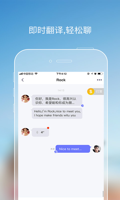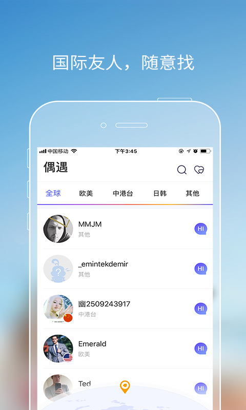 1.偶遇:世界各地帅哥和美女等你来偶遇,想和法国美女来一个浪漫的约会?想和德国绅士邂逅一场美丽的际遇?全面的个人资料,让你快速了解异国友人,随手点个赞、发送一声hi,即可轻松畅聊全球!