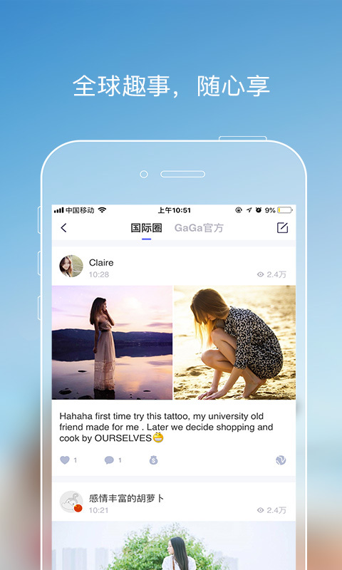 GaGaHi用户遍布全球180多个国家和地区,德国帅哥、美国辣妹、韩国偶吧、日本萌妹子等异国好友随意轻松畅聊,锻炼你的英语口语,帮助你了解世界各地文化,开拓眼界,丰富阅历,放眼全球,与世界沟通。