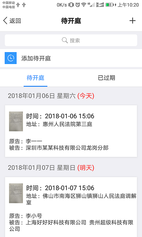 3.“待开庭”,律师添加了开庭信息,只要开庭期限没有超过今天,那么在待开庭中将会显示出来,并按开庭的顺序显示,同时每天早上7:20APP也会弹出一条提醒提示。待开庭中也可以查看要开庭案件的详细信息。