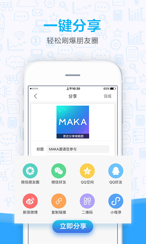 【一键分享】快速分享到微信、朋友圈、微博、QQ、QQ空间等社交网络,随时更新分享封面图和文案,让作品更个性化。