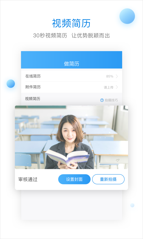 【视频简历】椅子网还创立了极具特色的视频简历服务,学生面试不必东奔西跑。致力打通招聘面试的“zui后一公里”,线下校招与线上直播无缝对接,颠覆传统线下双选会、宣讲会模式,实现招聘与就业的效率极大化。