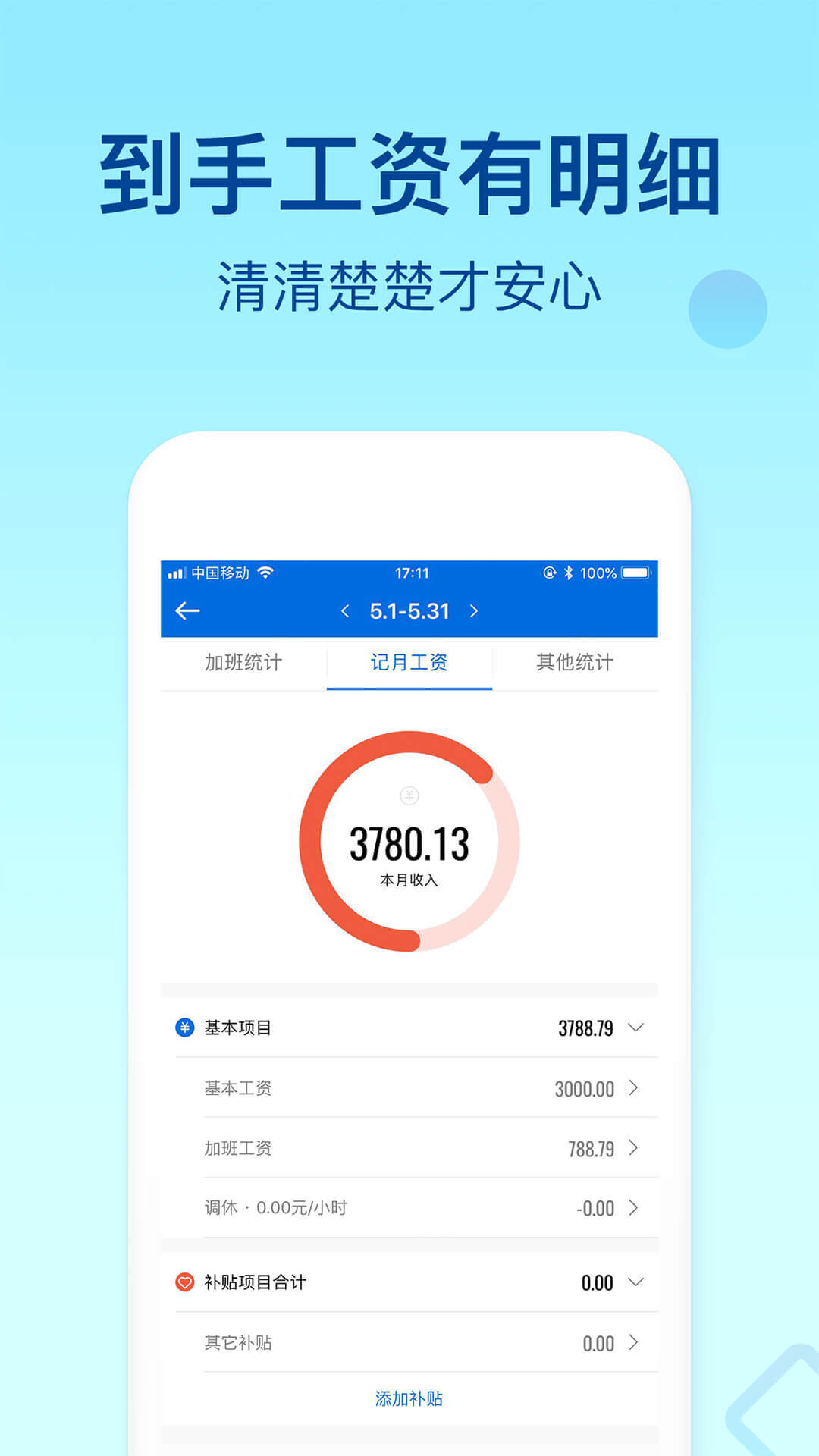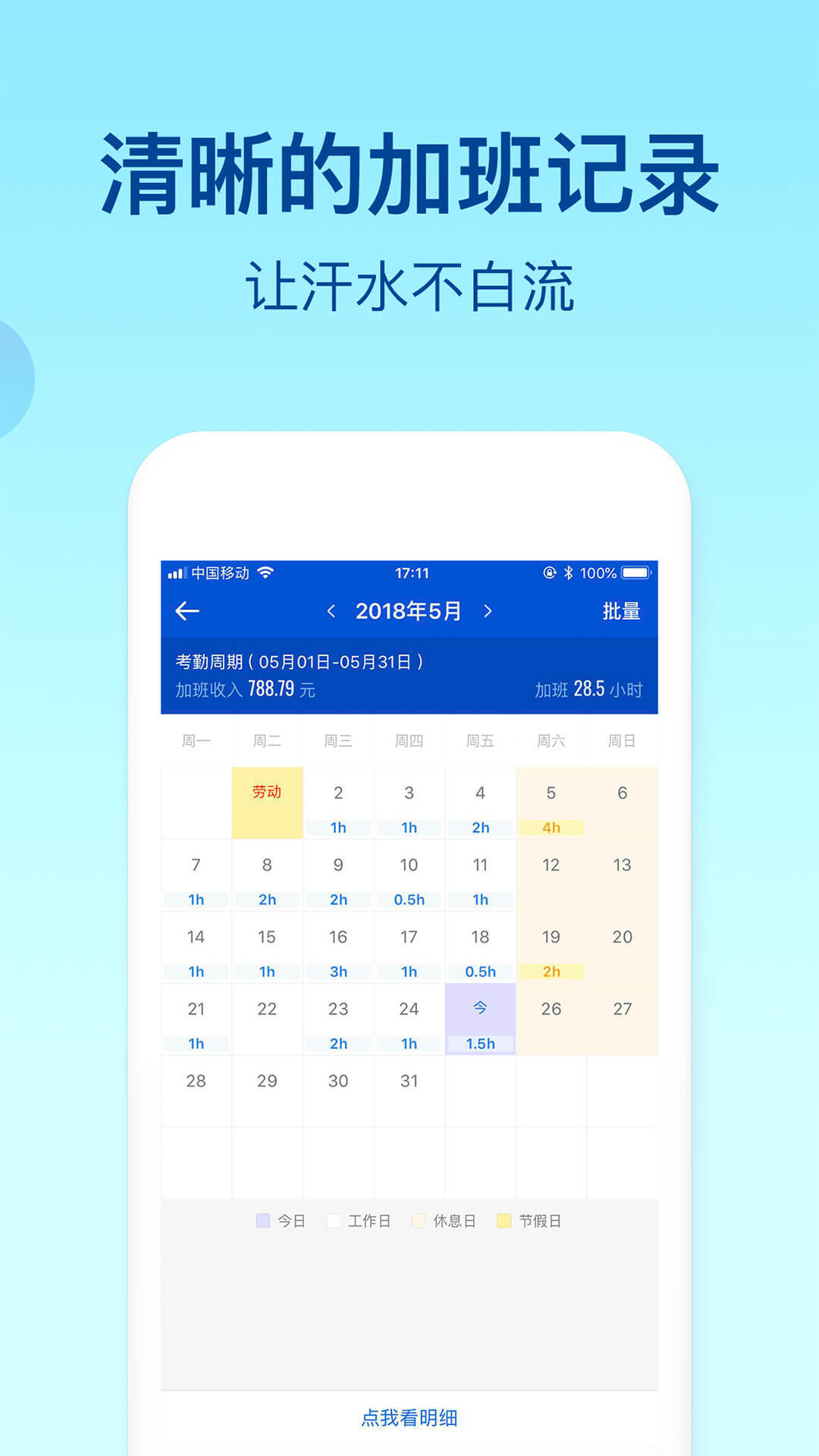 手机记录加班时间,自动计算加班工资及当月总工资,解决用户错记漏记问题。