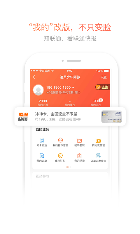 【我的联通】汇集全部我的业务、我的奖品、我的资产。我的业务和奖品一览无余。