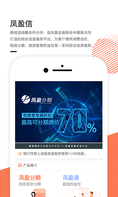 凤盈信是由碧桂园战略合作伙伴——凤凰金服打造的综合信息服务应用。目前凤盈信平台展示三款产品信息——凤盈安驰、凤盈通,以及凤盈分期。