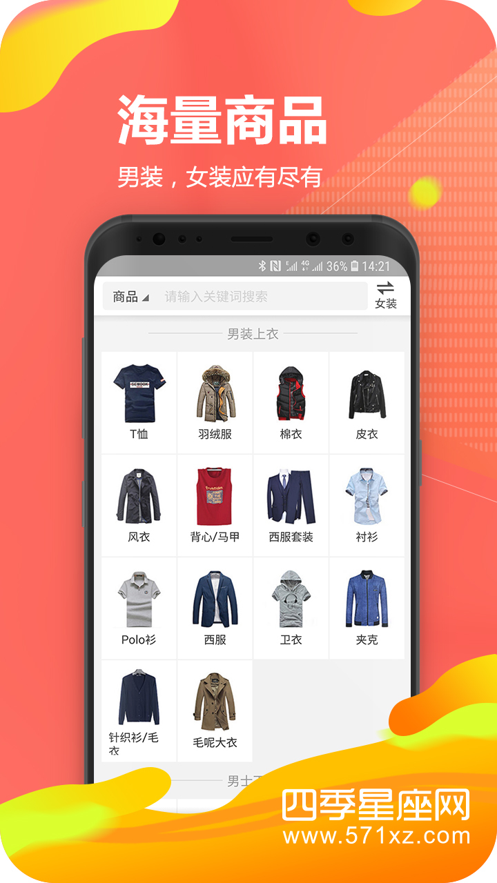 四季星座网专注于技术创新和服务创新,致力于将电子商务与实体市场完美结合,成功开拓了一件代发、零库存备货等交易模式,实现了零秒上新、知识产权保护、一键上传等便捷服务,是新兴的S2B市场模式的践行者,是国内较早以线下资源整合辅助经销商完成用户需求的平台之一。星座进货宝是为网店卖家提供一键找服装服饰类货源的工具,在APP上可以将看到的衣服或者商品图片保存到手机本地,然后用APP上的图片找货源功能在星座进货宝上找到同款或者相似款的批发货源。