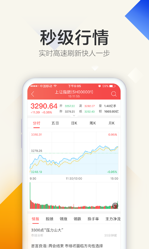 大行情是中国在美上市财经互联网公司——金融界全新推出的高端版APP,旨在为广大股民提供可靠的智能金融产品和专业而及时的行情分析解读。作为一款全新智能炒股软件,大行情Z3智能金融超级引擎,使用业界先进的人工智能算法,对近十年沪深数据进行深度机器学习,通过可靠的智能金融产品让用户跑在市场先列。大行情同时会及时通过视频、直播等形式提供有关大盘走势、市场风格的全方位解读,让行情走势对您来说不再有秘密;干货满满的操盘技术教学更是能让您迅速跻身交易高手之列!