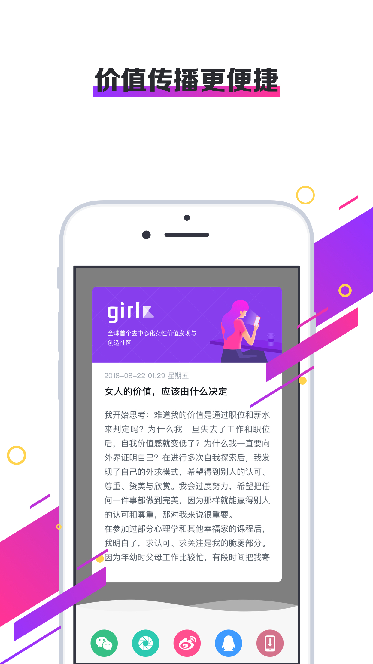 girlX致力于为全球女性用户创造一个专属的自由开放的社区,为全球每一位看似平凡却又不平凡的女性找到自己合适的定位,发现自身价值,塑造全新自我,通过个人努力得到反馈激励,使自身价值得到释放。