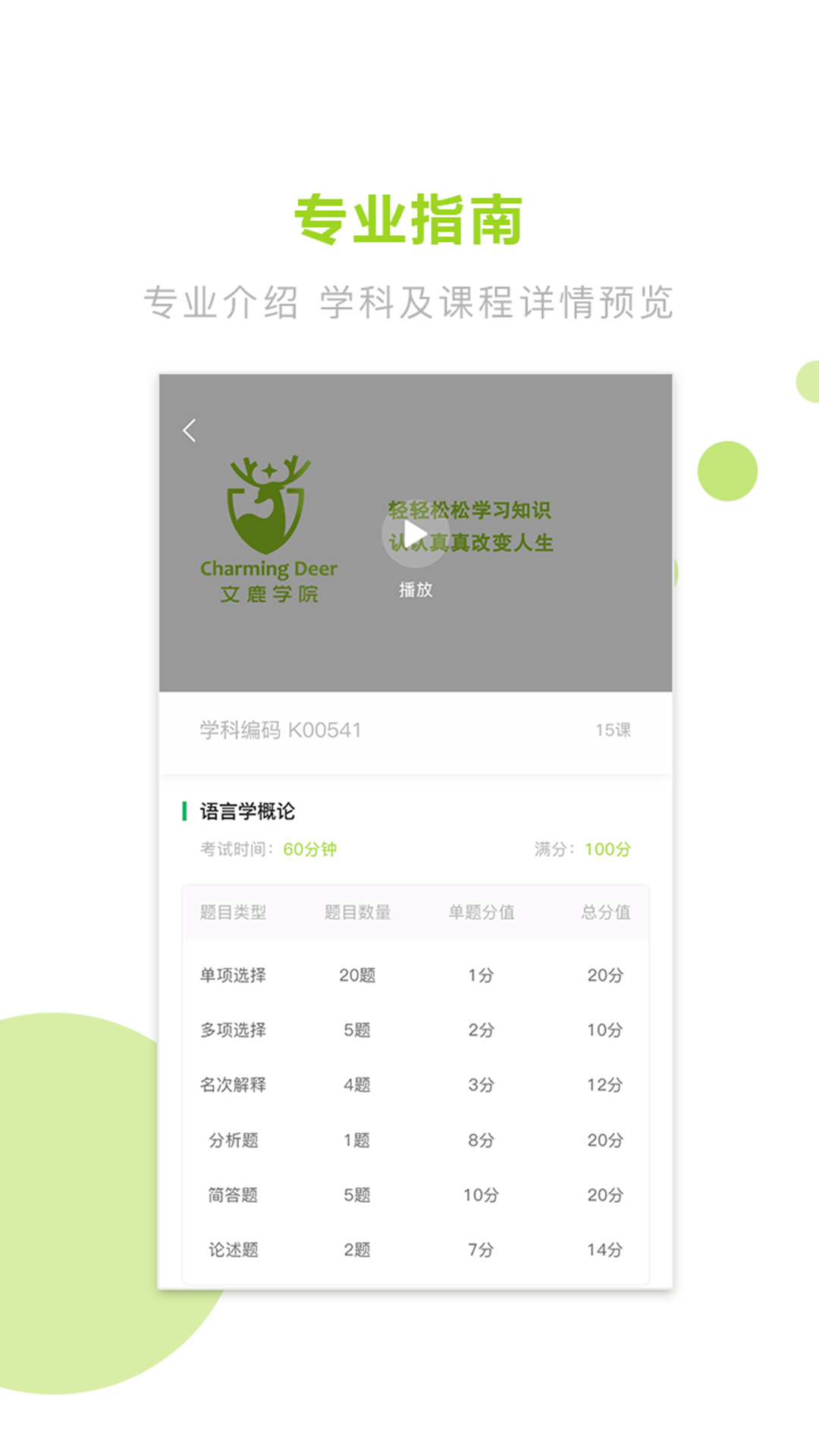 文鹿学院是针对高等教育自学考试学员专门研发的线上学习产品。它集数据分析、名师讲评、考务指导、能力测评、前辈分享等多项功能于一体。同时提供量身定做的个性化专属学习计划,高频精炼考点,视频辅导课程,学练结合,让学员轻松过关有保障。