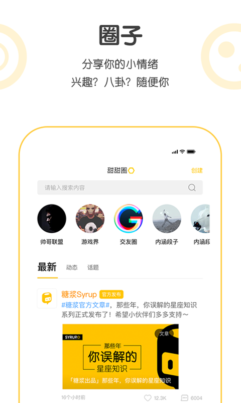 ●占星内容,根据星盘详细提供只属于你的占星分析带你解读星盘奥秘。 我究竟是什么样的人格 最近我心仪的TA会不会找我 这里给你专业占星师的私人订制 帮你更好了解自己知晓运势面对喜欢的人 赶紧偷偷和TA合个盘吧 内容社区 喜欢听歌这里有精选歌单推送 喜欢故事每天都有暖心图文和好听的声音与你道晚安 想要变成社交达人 撩妹小技巧打包发送 生活比你想象的更甜,糖浆让你与喜欢的人不期而遇,孤独的人都在这,快去黏住你想爱的人吧!!
