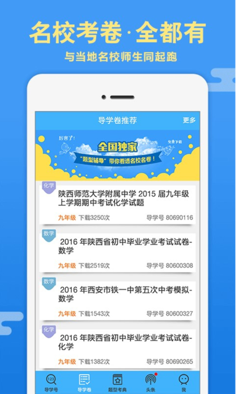 一、导学号简介: 导学号——全国中小学生最喜爱的作业辅导学习APP! 二、导学号功能: (一)、导学号搜题:作业题目统统变活了。 1、逐步提示:循序渐进,引导学生独立解决作业难题——给思路。 2、详细解答:入监护密码,查看解答过程,家长放心——看对错。 3、解后反思:让学生通过做一道题会一类题——做总结。 4、举一反三:锻炼学生举一反三,触类旁通——类似题。 5、推荐课程:结合本题目给出3-5分钟微课视频,解决相关知识点——小视频。 (二)、导学号拍题:迅速搜索难题,获取解析步骤,想怎么拍就怎么拍。 (三)、导学课:随时随地学课程,认准知识点,重点听讲解,大数据为你学习保驾护航。 (四)、导学卷:大数据技术直击95%以上重难点,全国最全、最前沿的中高考试卷库,祝您考试节节高。 三、导学号使用方法: 只要你的教辅书上印有导学号,先用手机扫描下载导学号app,当你遇到不会的题目或者家长遇到辅导不了的题目,只需下载导学号客户端,扫描题目前边的导学号或输入题目的导学号码,即可获取专家级辅导信息。