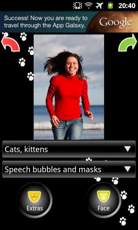 LookLike Cat automatically detects people on a photo and makes them look like cats or wild cats with masks and comic bubbles. Have great fun as you turn your family, friends into one or more cats, kittens, lions, leopard,... and send them funny photos through facebook, mail, etc. Important: ONLY FRONT facing people faces can be automatically detected, however if faces are not detected correctly you can add/delete masks or comic bubbles manually.★★★ MAIN FEATURES ★★★? automatically detects FRONT facing people faces on the photo? automatically generates comic bubbles with funny dialogs ? two sets of masks: domestic cats and wild cats like lion, leopard, gepard, lynx, puma? you can set front and back color of the bubble, thickness of the cloud line, opacity of the bubble, font size ? visual effects for speech bubbles (3D effect, magic effect and dizzy effect)? you can manually edit, add or delete comic bubbles or masks? you can use photos from gallery, directly form camera or one of the 4 test photos that are built in the app.? you can share the photos with your friends and family through facebook, mail, etc.Keywords: photo, comic bubbles, talk clouds, mask, greetings, meme, make me, look like kitten, make me a cat, make me a kitten, be cat, leopard, lion, lioness, gepard, lynx, puma