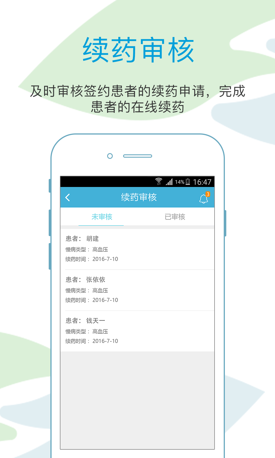 【续药审核】及时审核签约患者的续药申请,完成患者的在线续药;