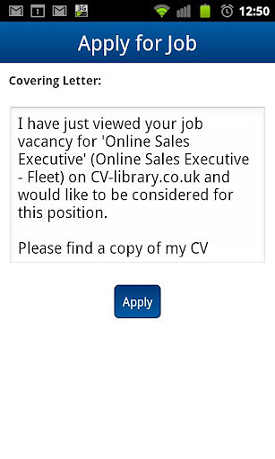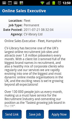 Search and apply for jobs on the go with the CV-Library app! The CV-Library Android app is one of the only apps of its kind allowing jobseekers to job search and apply for jobs on the go. FEATURES - Browse over 50,000 real-time UK jobs and find jobs - Apply for jobs straight away directly from the app - Log-in to your CV-Library account - Edit your cover letter - Set up job alerts - Save job searches - Add jobs to your favourites list - Email jobs to yourself or a friend Download CV-Library's new job search app for free and start job hunting today! Anyone looking for a job searcher app will benefit from this Android app. Visit www.cv-library.co.uk to add your CV to the CV Library database and be found by thousands of the UK's top recruiters and employers.