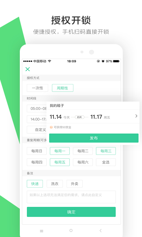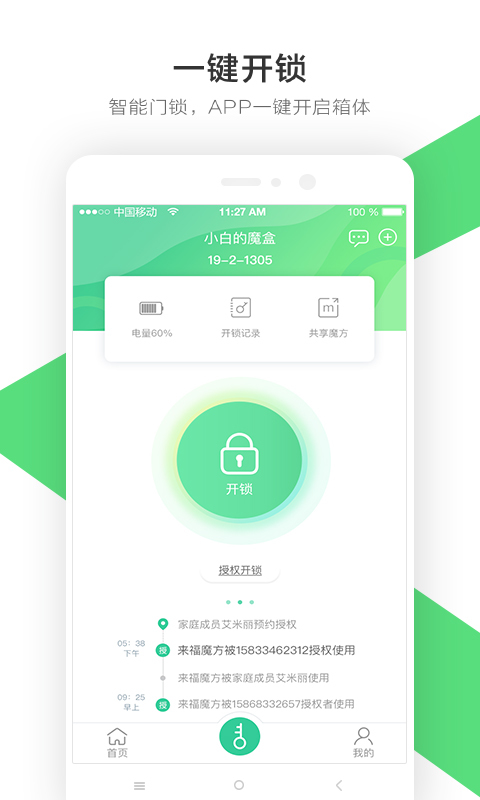 1、来福魔方APP可实现远程开启箱体,用户不在家或不方便开门的情况下,依然可以进行物品存取(快递、外卖等其他物流物品);
