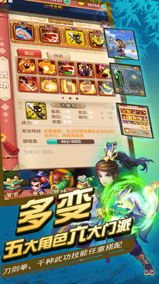 卡通风格操作界面,用卡通风格还原最淳朴的武侠世界。经典武侠音乐改编的背景音乐,带给你最轻松的武侠玩法。