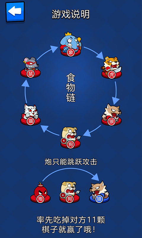 这可不是一般的斗兽棋,是带着一个任性的炮的斗兽棋,看隔壁的隔壁谁不顺眼就吃谁,就是这么任性。无敌是多么寂寞!