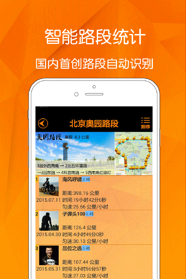 橘子单车特有的路段排名功能 将会对您每次骑行更加详细地分析统计.对于各路段大神一目了然。