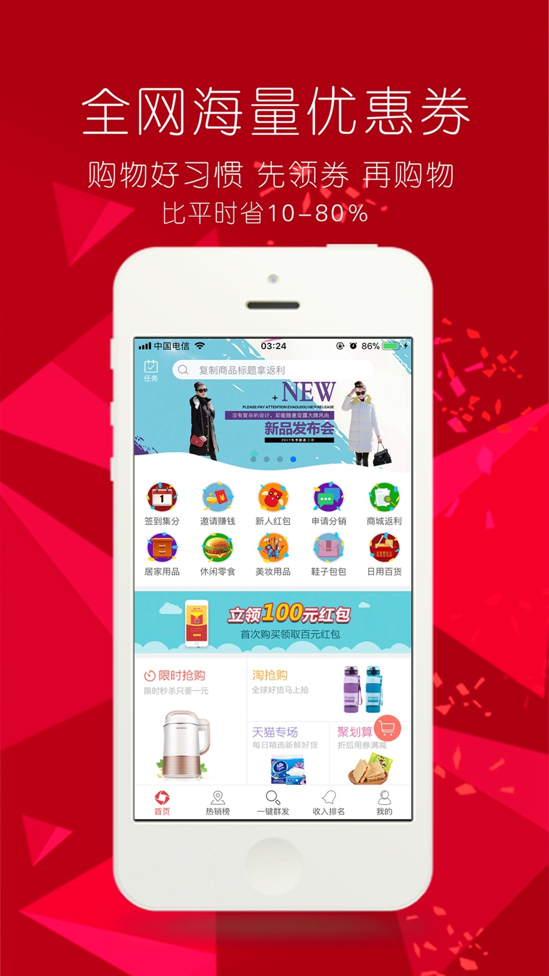 5、强大代言人功能,手指轻轻一点分享,朋友得到优惠买到各大商城商品的同时,您也领到丰厚的佣金收入,利人利己呢,轻松赚钱事业从这个火爆的APP完成!