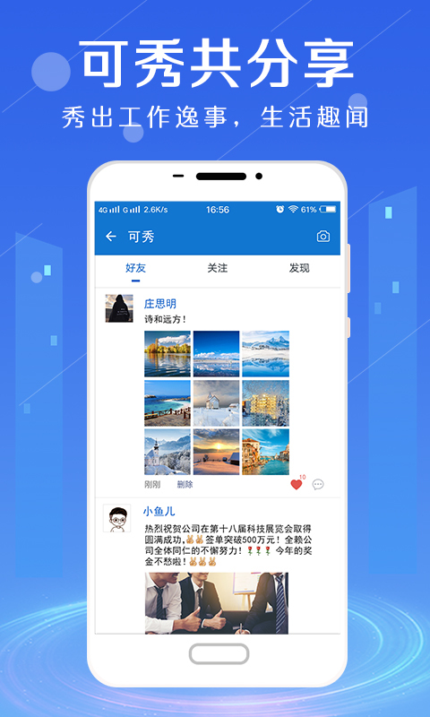 4、可秀共分享,秀出工作逸事,晒出生活趣闻,还可以把公司、行业牛人悄悄关注起来。