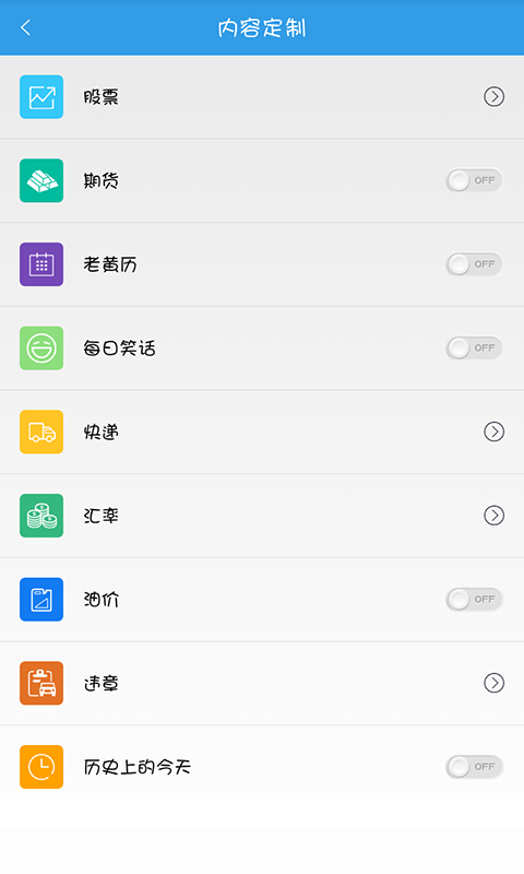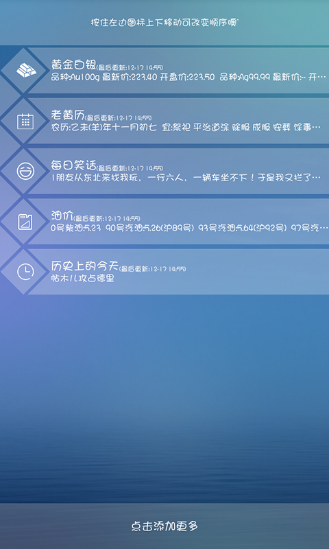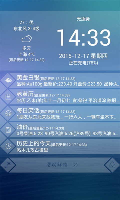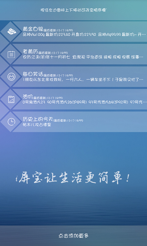 i屏宝是一款方便生活的实用锁屏,你可以在程序里选择你关心或所需要查询的工具添加在锁屏上。软件提供了时间天气、快递、股票、期货、油价、汇率等查询工具,更有每日笑话、老黄历、历史上的今天可供查看。